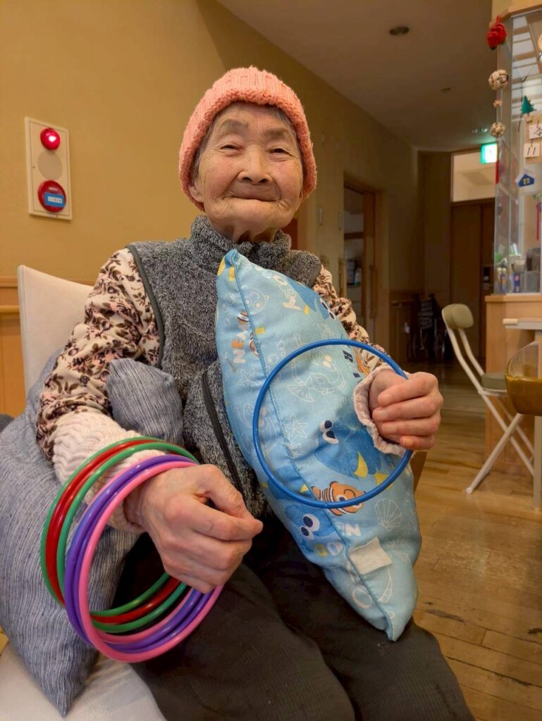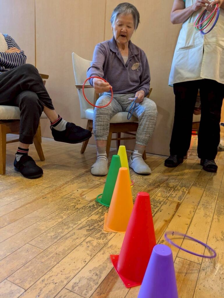 11月の行事では入居者の皆さまと一緒に「吸盤キャッチボール」と「輪投げ」を楽しむレクリエーションを行いました。