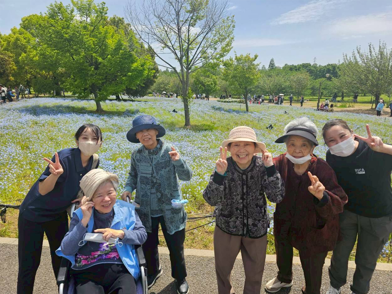先日、体調やご希望に合わせて数名の利用者様と一緒に、舎人公園へ外出し、見頃を迎えたネモフィラを観賞してきました。